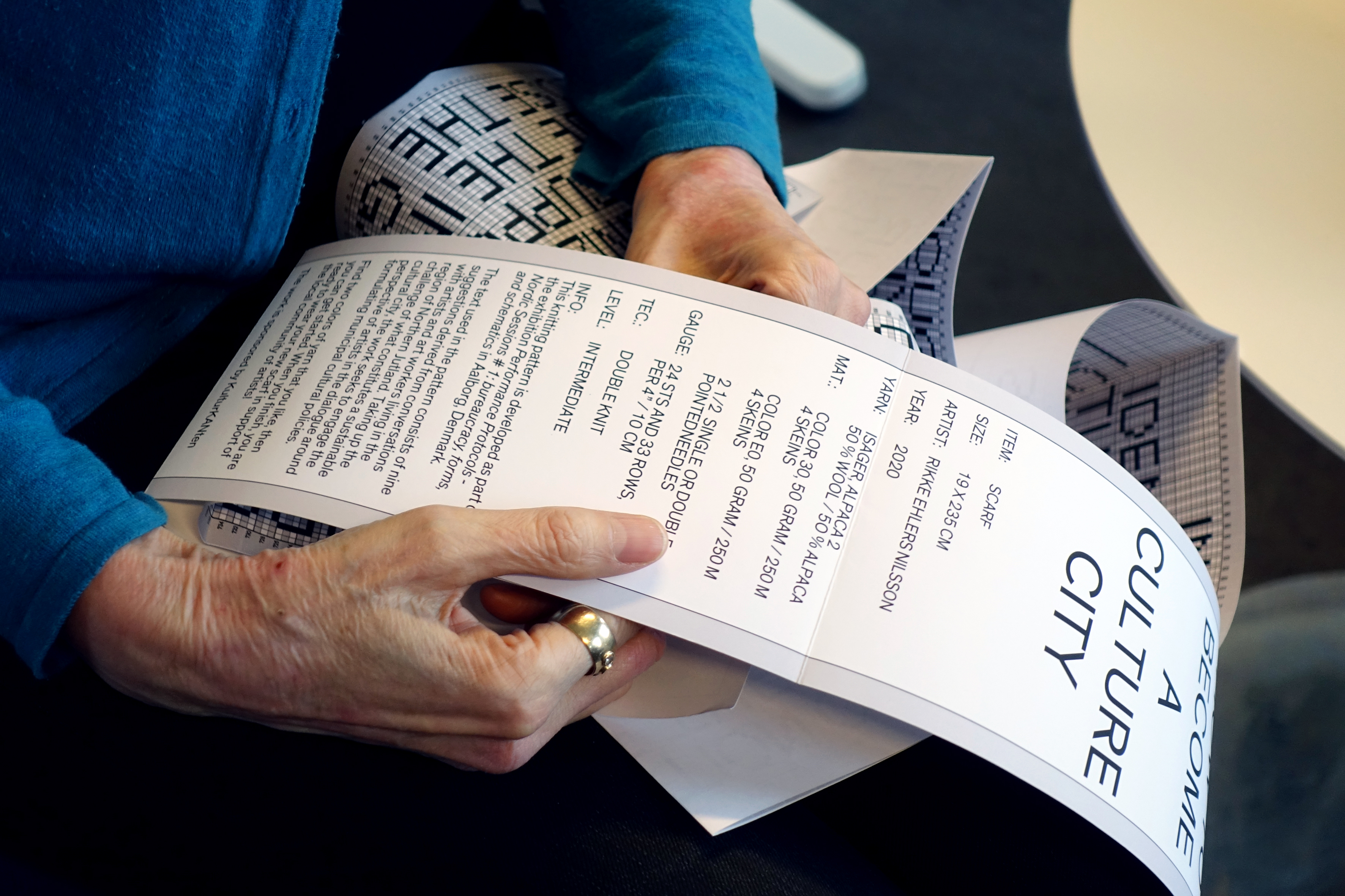 The work How to Become a Culture City (Knitting Pattern) is a How to Manual which consists of nine suggestions on how to become a culture city derived from conversations with artists and art workers living in the region of Northern Jutland turned into a knitting pattern. Taking up the challenge of what constitutes a sustainable cultural city, the work seeks to engage the perspective of artists in the dialogue around formulating municipal cultural policies.